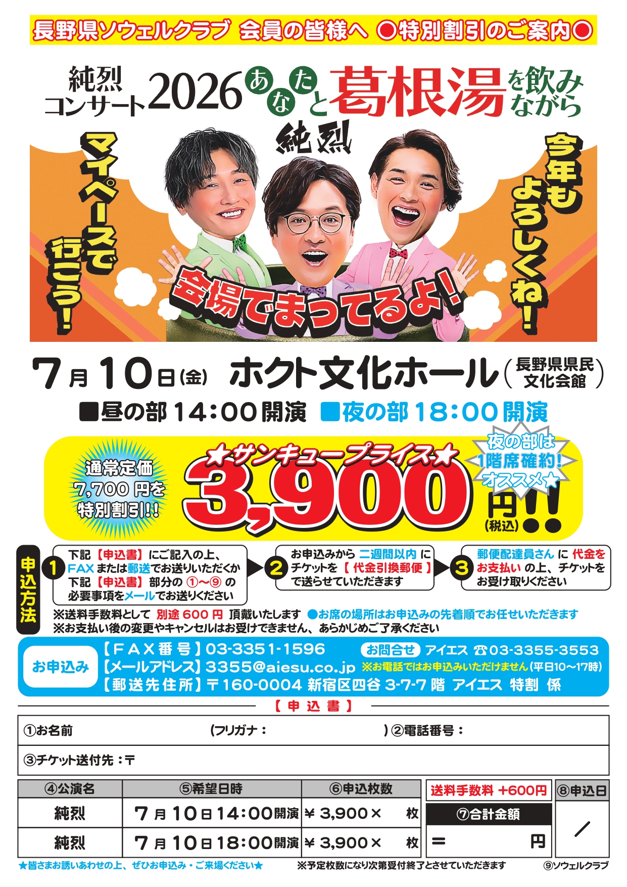 3,900円(税込) 特別割引! ※通常価格 7,700円(税込) ※夜の部は1階席確約! |