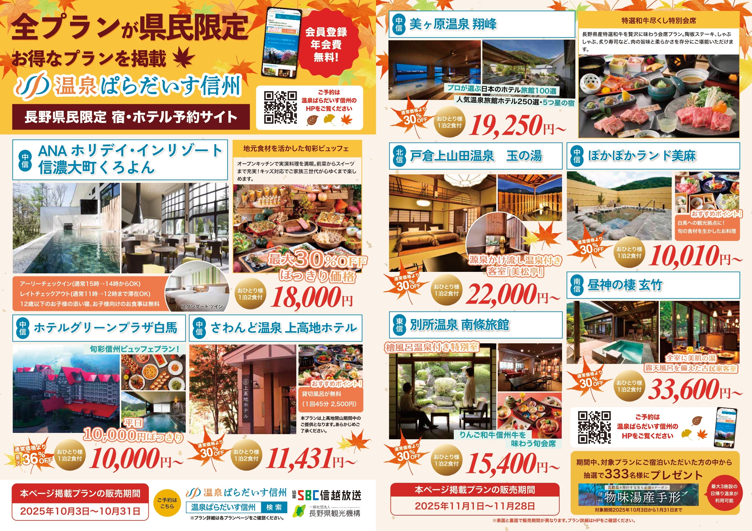 チラシ、または「温泉ぱらだいす信州」の公式HPをご覧ください。 ※第一弾、第二弾と対象の宿・ホテルが変わります。 |
